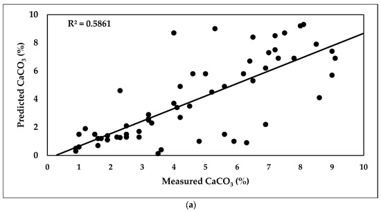To estimate SOM and CaCO3, a technique of (leave-one-out cross-validation) was applied for determining each spectral band’s values of P-coefficients and linking the spectral data with the examined soil parameters. Afterwards, the significant spectral bands which strongly correlated with the examined soil parameters were extracted by the PLSR model [37]. For evaluating the PLSR performance in estimating soil properties and the EF-Factor, some statistical parameters were used. These parameters are root mean square error (RMSE), Ratio of Performance deviation (RPD), and R-squared [38].