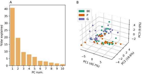 (A) Variance explained by each PC and (B) scatter plot for PC1, PC2, and PC3 for element reference concentrations.