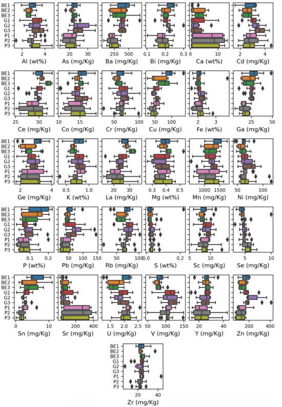 Variability of reference concentrations between each core follows a different pattern. For example, for Ca and Sr, cores of soil types BE and G have almost the same mean and range, but cores of soil type P have much wider range and higher Ca and Sr concentration. For phosphorus, soil cores with BE soil have a higher and wider range compared to soil cores with P and G soils. For S, nearly all the cores have the same range and mean (Figure 2).