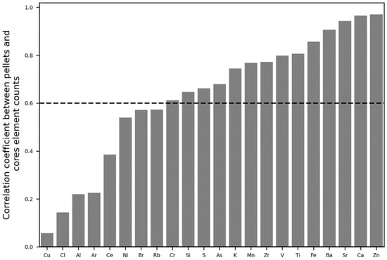 Correlation coefficient between pellets and core element counts and 0.6 threshold for keeping the element for calibration input.