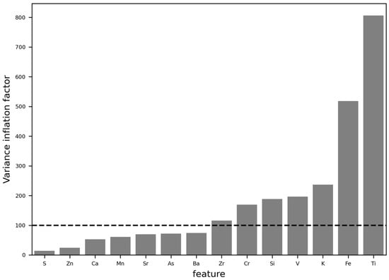 Elements were selected based on their correlation coefficient between counts of the pellets and the cores at a r = 0.60 threshold (Figure 3) and based on their variance inflation factor at a VIF of 100 (Figure 4). Final elements retained as input features for calibration were S, Zn, Ca, Mn, Sr, As, and Ba.