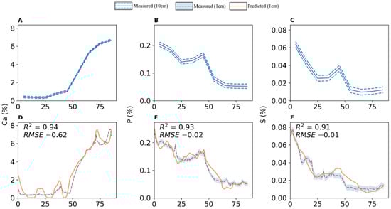 Measured reference concentrations at 10 cm (A–C) and measured and predicted concentrations at 1 cm (D–F) for Ca, P, and S in a Brown Earth soil core.