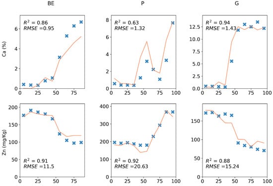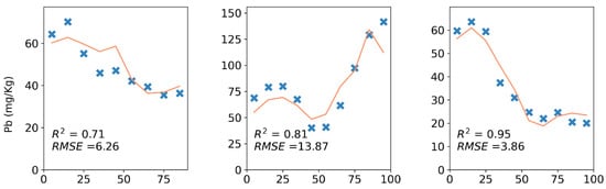 Ca, Zn, and Pb, 10 cm validation predictions (orange lines) and reference concentrations (blue cross marks) on three sample cores from three soil types.