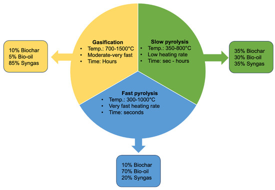 The biochar production process consists of three distinct stages: pre-pyrolysis, main-pyrolysis, and carbonaceous soil product formation [94,95]. The first stage involves the loss of moisture and some volatiles (<150 °C). Hemicelluloses and cellulose devolatilize and decompose rapidly in the second stage (200–500 °C) [96]. Degradation of lignin and other organic matter with stronger chemical bonds occurs in the final stage (above 500 °C) [97]. The biochar decomposes very slowly in the third step, forming a residue solid that is rich in carbon. When secondary charring occurs, the char becomes less reactive. Pyrolysis will produce mostly biochar at low temperatures (less than 450 °C when the heating rate is very slow) and mostly gases at high temperatures (greater than 800 °C) with rapid heating rates, depending on the thermal environment and the final temperature [98].
