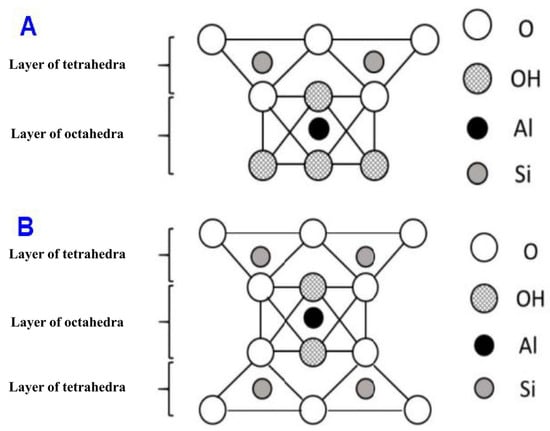 Chemical structures of 1:1 (A) and 2:1 (B) phyllosilicates [61].