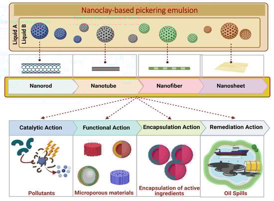 - Lu, T.; Gou, H.; Rao, H.; Zhao, G. Recent progress in nanoclay-based Pickering emulsion and applications. J. Environ. Chem. Eng. 2021, 9, 105941. [Google Scholar] [CrossRef]