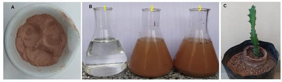 Liquid nanoclay is produced by dispersing a layered clay in water through an innovative mixing method that generates laminar and turbulent flow regimes. This dispersion occurs because the cationic nature of the nanoclay particles attracts water molecules, which act as anions, surrounding each flake. (A) Powdered clay. (B) Clay dissolved in water. (C) Hylocereus undatus cultivated in sand soil irrigated with LNC [71].