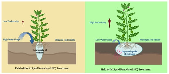 Nanoclays are extensively employed as nanocarriers for fertilizers, boasting a diverse array of materials available in both anionic and cationic variations. Anionic clays or hydrotalcite-like compound, alternatively known as layered double hydroxides (LDH), possess a distinctive capacity for exchanging anions. This property makes them exceptionally well-suited for facilitating the transport of phosphate, borate, and nitrate ions [110,111]. The addition of liquid nanoclay to sand soil offers a range of benefits that contribute to improved soil quality, increased plant productivity, and environmental sustainability (Figure 5). The illustration describes how the improved soil structure with liquid nanoclay (LNC) can lead to improved soil stability, nutrient and water retention, reduced erosion, increased soil fertility, improved seed germination, and increased environmental sustainability. It binds to nutrients, limiting their loss, and increases water retention, lowering the need for regular watering. In coastal locations and high-rainfall zones, LNC also lessens soil erosion, improving soil cohesiveness. It also increases the rates at which seeds germinate by giving the soil a sturdy structure and retaining moisture around the seeds. LNC is widely accessible and simple to use due to its affordability. Additionally, it prolongs the times during which plants develop, increasing their resistance to climate change in their surroundings [71].