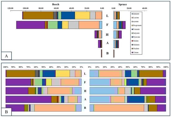 The concentration of low molecular mass organic acids under beech and spruce forests. (A) Comparison of the low molecular mass organic acids between beech and spruce forests, expressed in mmol kg−1. (B) The translocation of low molecular mass organic acids expressed as a percentage (%) through the whole soil profile in each forest stand (mean value). Litter horizon (L), fermentation horizon (F), humified horizon (H), organo-mineral horizon (A), and subsurface mineral horizon (B—spodic or cambic).