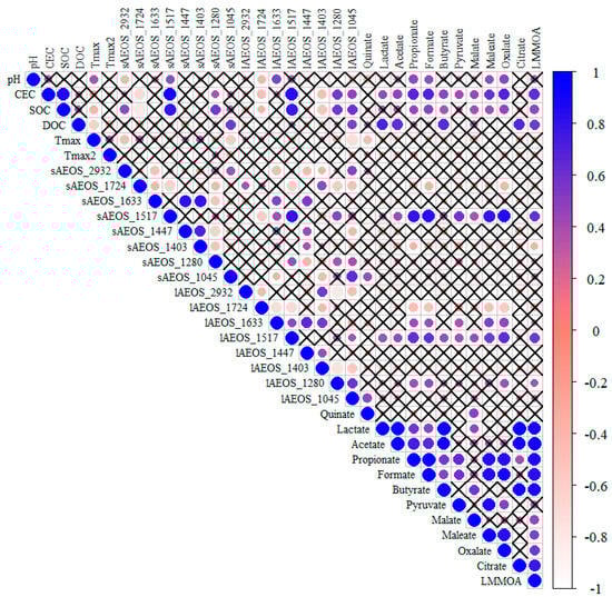 Correlation matrix plot of all data among the soil properties under forest tree species: cation exchange capacity (CEC), soil organic carbon (SOC), dissolved organic carbon (DOC), thermal analysis presented as maximum temperatures (Tmax and Tmax2), amount of relative reflectance of soluble alkaline-extractable organic substance (sAEOS), low-solubility alkaline-extractable organic substance (lAEOS), and low molecule mass organic acids (LMMOAs).