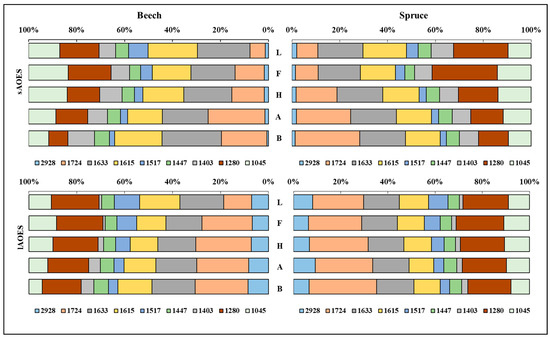 The reflectance bands of soluble alkaline-extractable organic substances (sAEOSs) and low-solubility alkaline-extractable organic substances (lAEOSs), expressed as %, in each horizon under beech and spruce forests. Litter horizon (L), fermentation horizon (F), humified horizon (H), organo-mineral horizon (A), and subsurface mineral horizon (B−spodic or cambic).