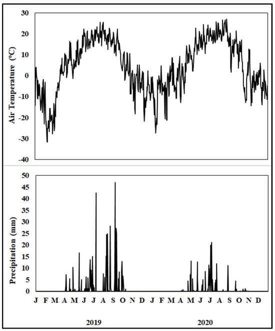 Daily air temperature and precipitation from January 2019 to December 2020 at the study site. The upper-case letter in the x-axis denotes months.
