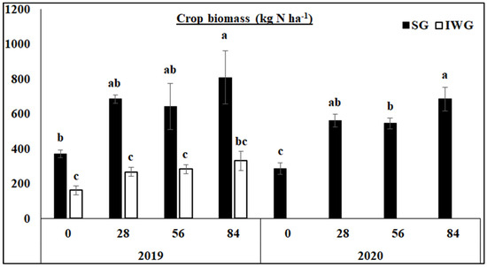Aboveground biomass was significantly greater for SG than IWG at all N fertilization rates in 2019 (Figure 2). Aboveground biomass was also greater for 84 than 0 kg N ha−1 in 2019 and greater for 84 than 56 and 0 kg N ha−1 in 2020. Nitrogen fertilization had no effect on aboveground biomass for IWG in 2019. In 2020, aboveground biomass for IWG was not measured because of poor growth.