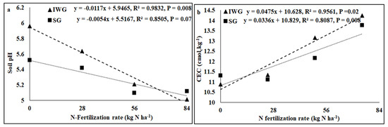 Perennial cover crop affected K concentration and K base saturation (Table 1). Both K concentration and K base saturation were greater for IWG than SG. The nitrogen fertilization rate affected pH, electrical conductivity (EC), K, Ca, Mg, and P concentrations, CEC, and base saturations of K, Ca, and Mg where the linear response of the N fertilization rate was significant. The perennial bioenergy crop × N fertilization rate interaction was significant for P concentration where the linear response of the N fertilization rate was significant. As the N fertilization rate increased from 0 to 84 kg N kg−1, pH and concentrations and base saturations of Ca, Mg, and K decreased, but CEC increased (Figure 3 and Figure 4). Phosphorus concentration increased with the increased N fertilization rate for IWG, but N fertilization has no effect on P concentration for SG (Figure 4).