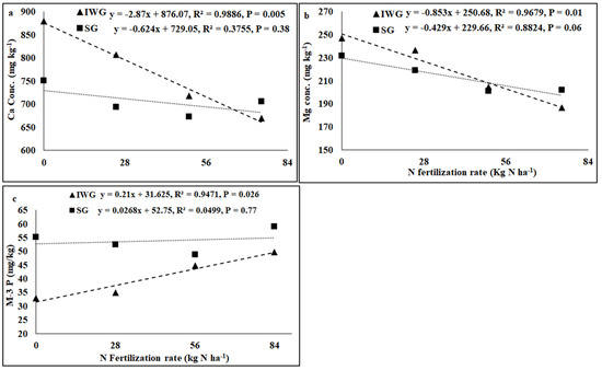 Relationship between N fertilization rate and (a) soil Ca and (b) Mg concentrations and (c) Mehlich-3 phosphorus (M-3 P) under perennial bioenergy crops.