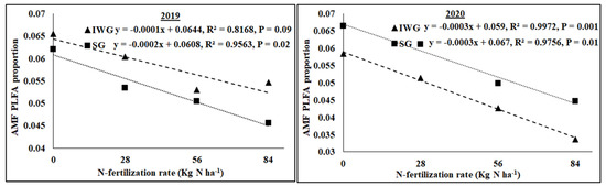 Relationship between N fertilization rate and AMF PLFA proportion under perennial bioenergy crops in 2019 and 2020.