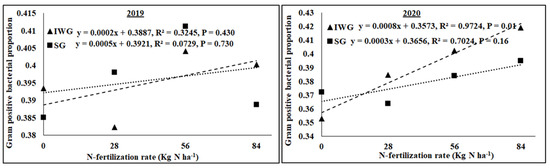 Relationship between N fertilization rate and Gram-positive bacterial proportion under perennial bioenergy crops in 2019 and 2020. Perennial bioenergy crops are IWG, intermediate wheatgrass, and SG, switchgrass.