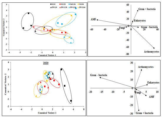 Canonical multivariate analysis of variance of phospholipid fatty acid biomarkers for perennial bioenergy crops at different N fertilization rates in 2019 and 2020. Perennial bioenergy crops are IWG, intermediate wheatgrass, and SG, switchgrass. Vectors represent standardized canonical coefficients and indicate relative contribution of each biomarker group to each canonical variate.