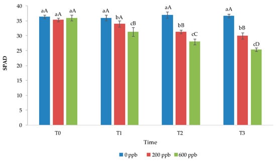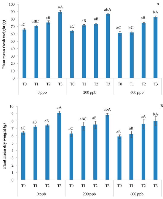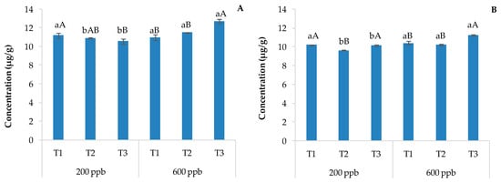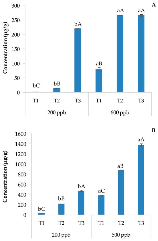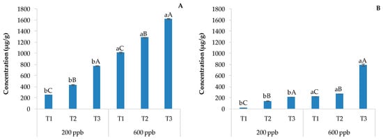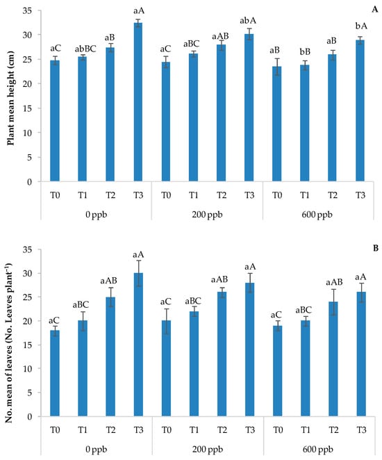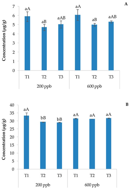 | 600 ppb | T1 | A | 64.7 b | 73.7 a | 32.0 b | 21.4 a |