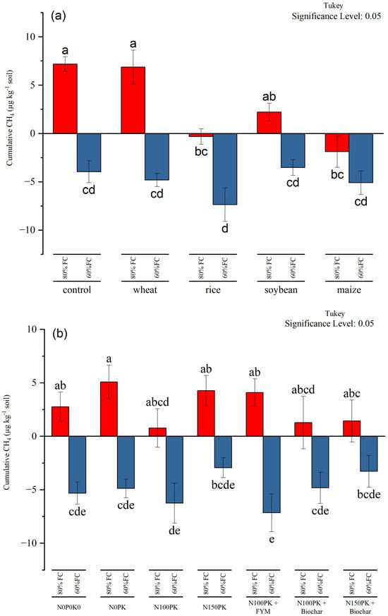 The magnitude and trend of temporal dynamics of CH4 fluxes differed with treatments (Figures S1 and S2). For 60% FC, the average CH4 fluxes ranged from −8.25 µg C kg−1 soil day−1 (maize + N0P0K0) to 5.41 µg C kg−1 soil day−1 (soil without residue + N100PK + biochar@ 5 Mg/ha). Similarly, at 80% FC, the average CH4 fluxes ranged from −1.76 µg C kg−1 soil day−1 (soybean + N100PK) to 6.91 µg C kg−1 soil day−1 (soybean + N0PK). Irrespective of nutrient management, the cumulative mean CH4 flux was negative and the lowest in soil amended with maize residue (−1.87 µg C kg−1 soil). The cumulative CH4 fluxes (µg C kg−1 soil) during 87 days of incubation followed the order maize (−1.87) >rice (−0.33) ≈ soybean (2.21) > wheat (6.88) >control soil (7.18) (Figure 1). Averaged across residue types, the trend of nutrient management on CH4 fluxes (µg C kg−1 soil) was N100PK (0.78) < N100PK + biochar (1.28) < N150PK + biochar (1.43) < N0P0K0 (2.76) < N100PK + manure (4.10) < N150PK (4.27) < N0PK (5.08). Mixed responses of nutrient application were observed on CH4 fluxes; e.g., N100PK + manure, N150PK, and N0PK nutrient treatments increased CH4 emission by 48–84% compared with minus nutrients, N0P0K0. On the contrary, N100PK, N100PK + biochar, N150PK+ biochar decreased CH4 emission by 48 to 72% across residue. Further, the effect of nutrient management varied significantly with different residue treatments and soil without residue. In soil without residue, the nutrient effect followed the order N100PK + biochar < N0P0K0 < N150PK < N0PK < N100PK < N100PK + manure < N150PK + biochar. However, in soil amended with rice residue, the nutrient effect varied in the order N100PK + biochar < N100PK < N150PK < N0P0K0 < N100PK + manure < N150PK + biochar.