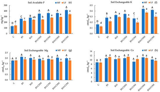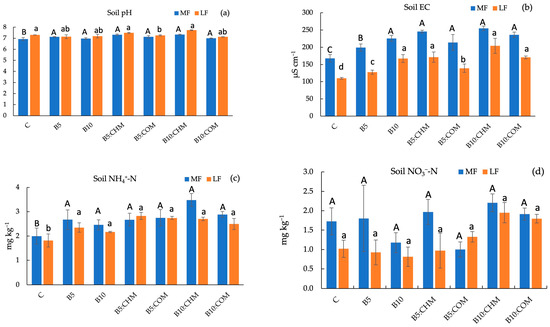 Before cultivation, the MF and LF soils had a pH of 6.17 and 7.86, respectively. Soil pH tended to increase in the B5, B10, B5:CHM, B5:COM, B10:CHM, and B10:COM treatments compared to C in MF soil (Figure 1a). Thus, biochar has the potential to increase the pH of MF soil. According to Gul et al. [28], negatively charged functional groups on the surface of biochar, such as hydroxyl, phenolic, and carboxylic groups, increase soil pH by binding excess H+ ions from the soil solution to the biochar surface. With respect to LF soil, no significant difference in pH was noted among the treatments; however, for some treatments, such as B5, B10, B5:COM, and B10:COM, the soil pH was reduced relative to that of C. Abeishamkesh et al. [29] revealed that the high calcium carbonate content in calcareous soils induces a high buffering effect on soil pH, resulting in no pH change when using rice husk biochar on alkaline soils. Therefore, biochar can either increase or decrease soil pH, depending on the original soil pH.