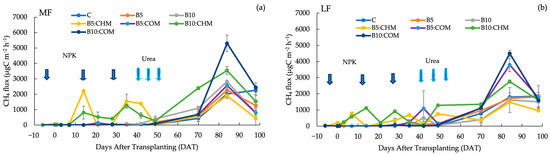 Figure 2 depicts the CH4 and N2O fluxes in both soils. The CH4 fluxes in both MF and LF soils fluctuated during the early growth stages of the paddy rice. The CH4 fluxes under different treatments peaked during the late growth stages. At 84 DAT, B10:COM-treated MF and LF soils reached maximum peaks of 5302.9 and 4498.9 µgC m−2 h−1, respectively (Figure 2a,b).