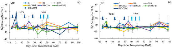 Regarding N2O fluxes, the variation was wide throughout the growing season, not only in the MF soil but also in the LF soil. The maximum peak was observed in B10:COM (54.9 µgN m−2 h−1) at the beginning of rice cultivation, 1 DAT, in the MF soil, whereas in B5:COM (24.2 µgN m−2 h−1) was seen at 35 DAT in the LF soil. The B10:CHM and B5 treatments showed almost the same peak, with the maximum peak of B5:COM at 1 and 84 DAT in the LF soil (Figure 2c,d).