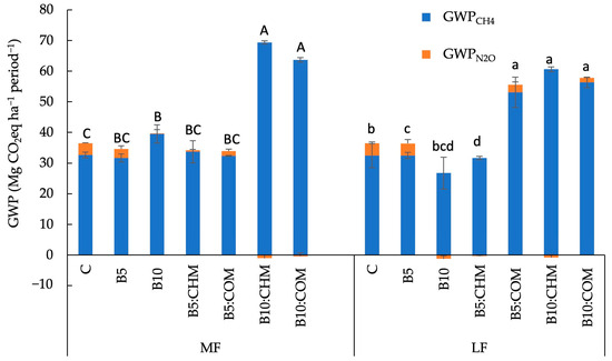 GWPtotal under various treatments. Data are expressed as mean ± standard error. The different letters above the bar indicate statistically significant differences at the 5% level according to the LSD test. MF: medium-fertility soil, LF: low-fertility soil. No biochar (C), 5 t ha−1 of rice husk biochar application (B5), 10 t ha−1 of rice husk biochar application (B10), 5 t ha−1 of rice husk biochar + 5 t ha−1 of chicken manure (B5:CHM), 5 t ha−1 of rice husk biochar + 5 t ha−1 of cow manure (B5:COM), 10 t ha−1 of rice husk biochar + 5 t ha−1 of chicken manure (B10:CHM), 10 t ha−1 of rice husk biochar + 5 t ha−1 of cow manure (B10:COM).
