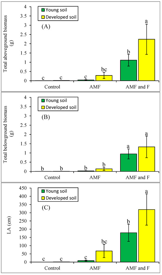 Biomass of alder plants in Experiment 1 as aboveground (A) and belowground biomass (B) and leaf area (LA, cm2; (C)). The letters are based on the results of a 2-way ANOVA for biomass of alder plants (p < 0.05), followed by a Fisher’s least significant differences post hoc test (see Table S1). AMF: arbuscular mycorrhizal fungi; F: Frankia.