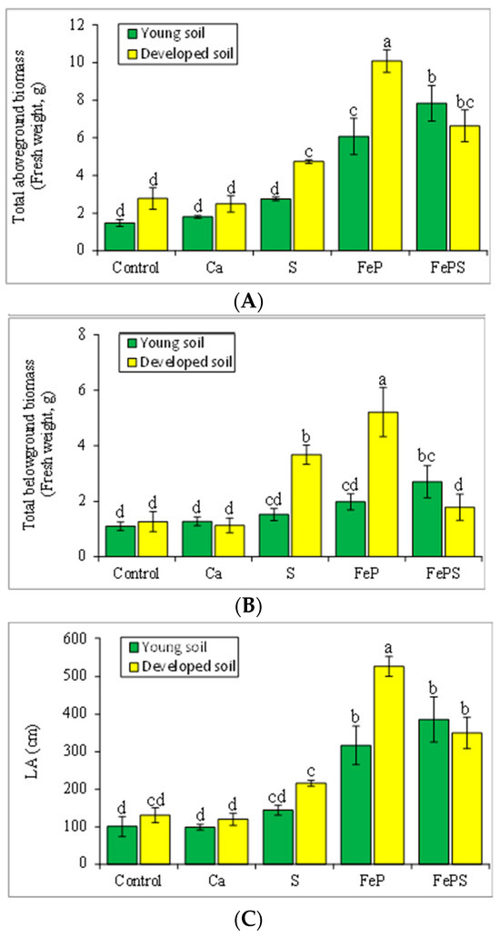 In the second experiment, the aboveground biomass of alder plants was significantly higher in the developed soil compared with the young soil, except for the FePS treatment (Figure 3A). The highest aboveground biomass was observed with the FeP treatment, and plants from the Ca treatment had the lowest aboveground biomass (similar to the control plants). Two-way ANOVA showed significant effects on the aboveground alder biomass of soil, chemical addition, and the interaction of soil and chemicals (F1,40 = 11.6, p < 0.01 for soil; F4,40 = 44.4, p < 0.001 for chemicals; F4,40 = 5.76, p < 0.001 for the interaction of soil and chemicals; Figure 3A, Table S2).