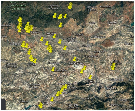 In light of the strong scientific progress seen in vegetation science, both ecologically and descriptively, we focused on the study of edaphic bioindicators [32,37,52]. For this purpose, we carried out a study of the grasslands present in olive groves in Spain. Sampling plots were originally selected between 2005 and 2007 by Cano Ortiz (Figure 1). The edaphic parameters were measured, and plot biodiversity was assessed, in order to establish a correlation analysis between nutrient levels and species abundance [62]. In addition, floristic sampling was conducted according to the phytosociological methodology that is widely employed in Mediterranean countries.