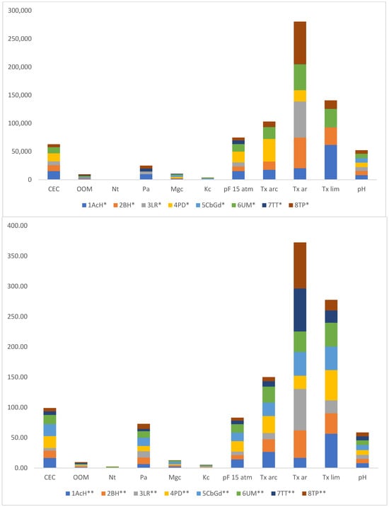 Comparative analysis of edaphic evolution for 8 associations between 2005 (*) and 2018 (**). 1AcH. Anacyclo clavati-Hordeetum leporini Cano-Ortiz et al. 2009. 2BH. Bromo scoparii-Hordeetum leporinii Rivas Martínez 1978. 3LR. Linario sparteae-Raphanetum raphanistri Cano-Ortiz et al. 2013. 4PD. Papaveri rhoeadis-Diplotaxietum virgatae Rivas Martínez 1978. 5CbGd. Centaureo baeticae-Glebionetum discolori Cano et al. 2024. 6UM. Urtico urentis-Malvetum neglectae (Knapp) Lohmeyer in Tüxen 1950. 7TT. Trifolio cherleri-Taeniatheretum capitis-medusae Rivas-Martínez and Izco 1977. 8TP. Trifolio cherleri-Plantaginetum bellardii Rivas Goday 1958. CEC = cation exchange capacity in meq/100 g; OOM = oxidable organic matter in %; Nt = total nitrogen in %; Pa = assimilable phosphorus in ppm; Mgc = exchangeable magnesium in meq/100 g; Kc = exchangeable potassium in meq/100 g; pF 15 atm = pressure at 15 atm (water retention capacity) in %; Tx arc = clayey texture in %; Tx ar = sandy texture in %; Tx lim = silty texture in %; pH.