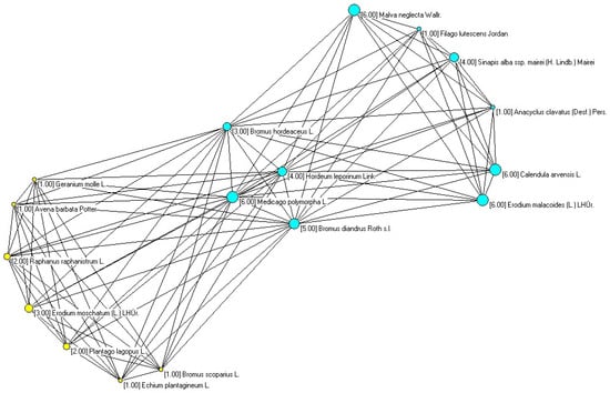 The program Pajek 1.10: http://vlado.fmf.uni-lj.si/pub/networks/pajek/ (accessed 8 January 2008) was used for the elaboration of the networks. The representation algorithm was the Kamada–Kawai algorithm. The species of the same association are shown with circular nodes of the same color and are located at the periphery of the graph, except for those that are located in more than two associations, which are located in the center and whose nodes are of the box type and white in color. All the nodes have a size relative to the number of associations in which they are placed, a number that is also indicated next to the name of each species.