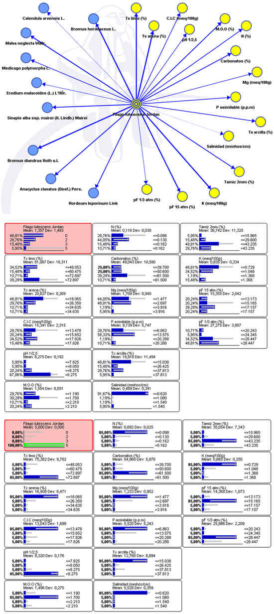 Bayesian network and propagation evidence for Filago lutescens, included in the Anacyclo clavati-Hordeetum leporini association.