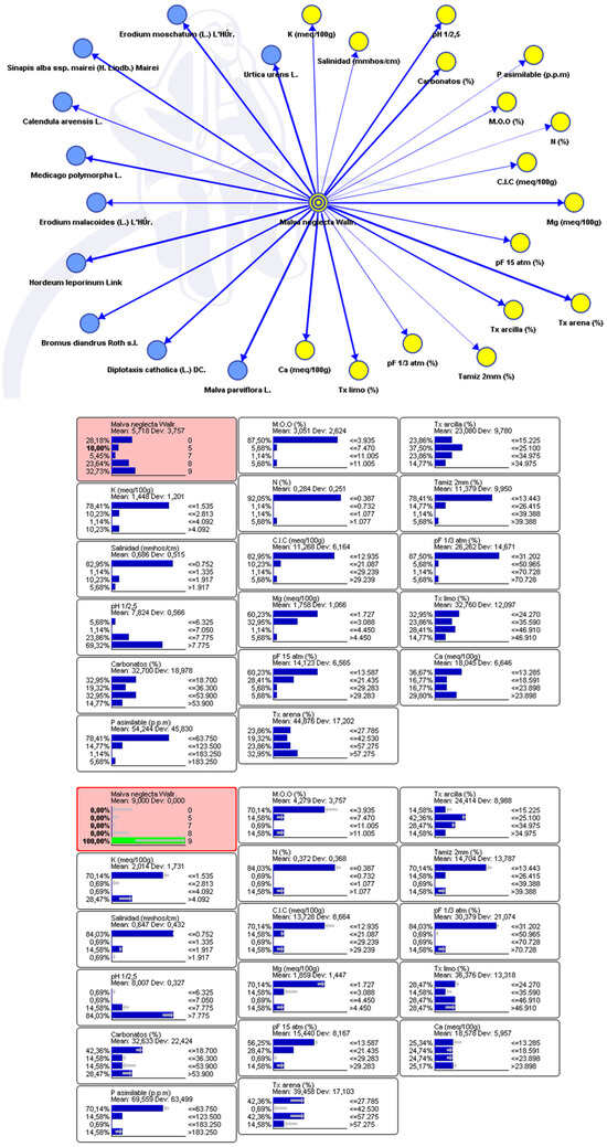 Bayesian network and propagation of the evidence for Malva neglecta in the Urtico urentis-Malvetum neglactae association.