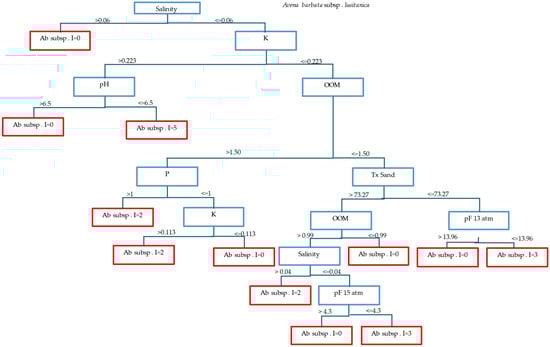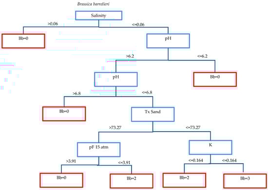 As can be seen in Table 4, the classification of this species depends on soil parameters such as salinity, K, pH, MOO, P, Tx Sand, pF 1/3 atm, and pF 15 atm. The most influential parameter is salinity since it has the highest GI value (0.290). In the decision tree shown below for this species, we observed Van deer Maaler indices of 5 for salinity values less than or equal to 0.06 mmhos/cm, K values greater than 6.5 meq/100 g, and pH less than or equal to 6.5 (Table 4) (Figure 7).