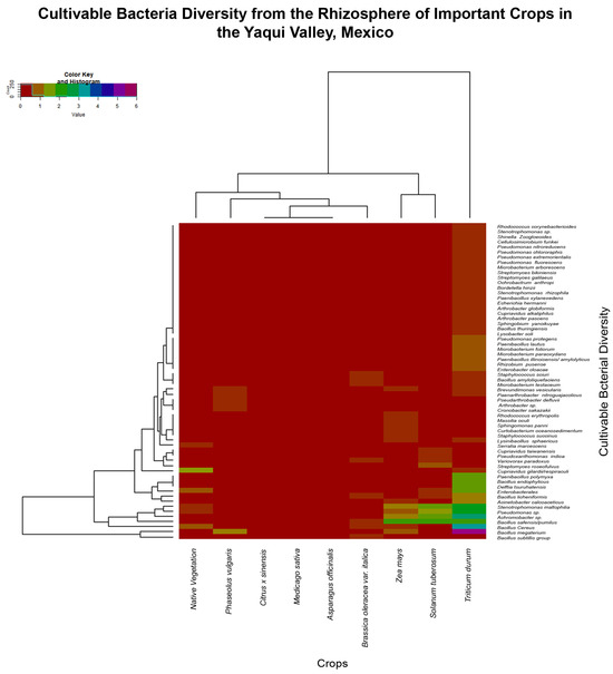 Heatmap of cultivable bacterial diversity from eight crops in comparison to the undisturbed native ecosystem in the Yaqui Valley, northwestern Mexico. Joint and hierarchical clustering of 232 bacterial strains associated with important economic crops were calculated by using Euclidean distance and an unweighted pair group method with an arithmetic average (UPGMA) linkage clustering procedure. The dendrogram on the left represents the bacterial genetic relation, while the dendrogram on the top represents the bacterial genera/species relation between the study sites.