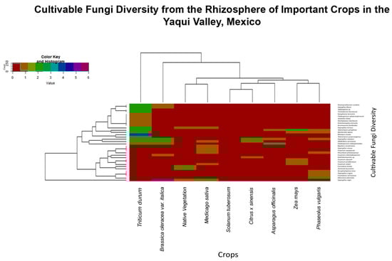 The matrix data was rearranged using Mothur v 1.48.1 [34], and bacterial and fungi strains and primary economic regional crops were organized using Euclidean distance and the unweighted pair group method with the arithmetic average (UPGMA) linkage clustering procedure. Comparisons in microbial population per studied crop were made with the default parameters of the R heatmap function.