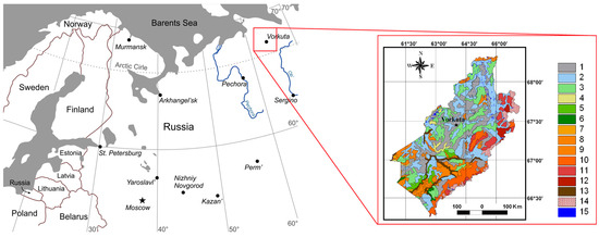 Soil map of Vorkuta district (Komi Republic, Russia): (1) Stagnic Cambisols; (2) Histic Gleysols; (3) Histic Cryosols; (4) Haplic Cambisols; (5) Folic Stagnic Retisols; (6) Histic Stagnic Retisols; (7) Albic Podzols; (8) Stagnic Podzols; (9) Histosols; (10) Cambisols (Skeletic); (11) Haplic Leptosols (Skeletic, Humic); (12) Haplic Cryosols; (13) Fluvisols; (14) golets (rock placers and outcrops); (15) bodies of water.