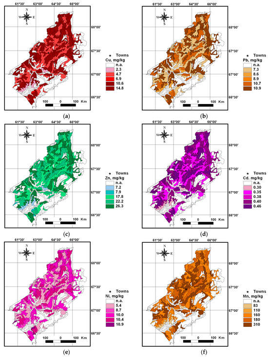 Maps of PTE content in soils of the Vorkuta district (Komi Republic, Russia): Cu—copper (a), Pb—lead (b), Zn—zinc (c), Cd—cadmium (d), Ni—nickel (e), Mn—manganese (f), n.a.—not analysed.