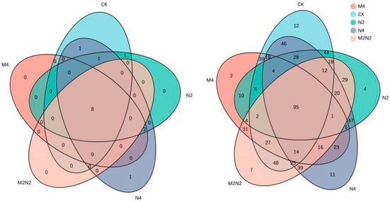 Venn analysis of soil fungi in phylum and genus level with different nitrogen fertilizer application. Note: the left panel shows the phylum level, and the right panel shows the genus level. CK, no fertilizer; N2, single application of chemical nitrogen fertilizer (urea 135 kg N hm−2 a−1); N4, single application of chemical nitrogen fertilizer (urea 270 kg N hm−2 a−1); M2N2, chemical nitrogen fertilizer with organic fertilizer (urea 135 kg N hm−2 a−1 + pig manure 135 kg N hm−2 a−1), M4, single application of organic fertilizer (270 kg N hm−2 a−1).