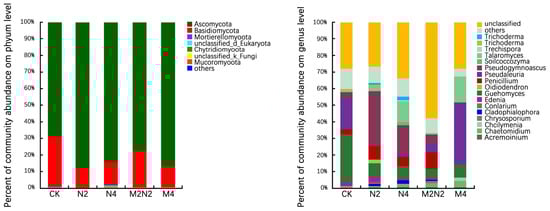Composition of soil fungi community in different nitrogen fertilizer treatments. Note: CK, no fertilizer; N2, single application of chemical nitrogen fertilizer (urea 135 kg N hm−2 a−1); N4, single application of chemical nitrogen fertilizer (urea 270 kg N hm−2 a−1); M2N2, chemical nitrogen fertilizer with organic fertilizer (urea 135 kg N hm−2 a−1 + pig manure 135 kg N hm−2 a−1), M4, single application of organic fertilizer (270 kg N hm−2 a−1).
