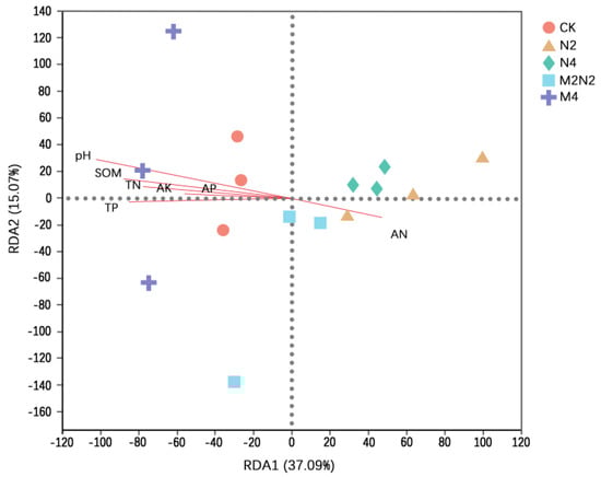 Redundancy analysis between soil fungi at genus level and the physical and chemical properties in different nitrogen fertilizer treatments. Note: SOM, soil organic matter; BD, bulk density; TN, total nitrogen; TK, total potassium; TP, total phosphorus; AN, alkaline nitrogen; AK, available potassium; AP, available phosphorus. CK, no fertilizer; N2, single application of chemical nitrogen fertilizer (urea 135 kg N hm−2 a−1); N4, single application of chemical nitrogen fertilizer (urea 270 kg N hm−2 a−1); M2N2, chemical nitrogen fertilizer with organic fertilizer (urea 135 kg N hm−2 a−1 + pig manure 135 kg N hm−2 a−1), M4, single application of organic fertilizer (270 kg N hm−2 a−1).