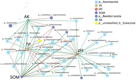 The network analysis of soil physical and chemical properties and genus-level fungi. Note: the species with a p less than 0.05 are not visualized in the network. SOM, soil organic matter; BD, bulk density; TN, total nitrogen; TK, total potassium; TP, total phosphorus; AN, alkaline nitrogen; AK, available potassium; AP, available phosphorus. Red lines indicate a positive correlation, and green lines indicate a negative correlation.