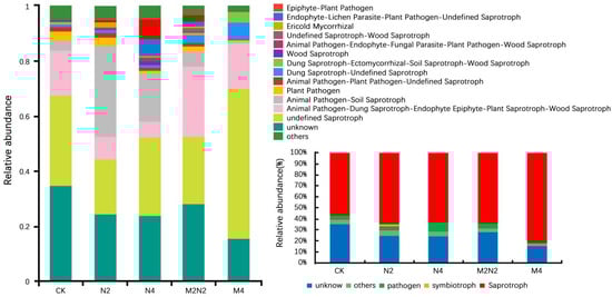 Soil fungi function prediction in different nitrogen fertilizer treatments classified by the FUNGuild system. Note: The abscissa represents the different nitrogen fertilizer treatments, and the ordinate indicates the proportion of microbial community abundance. CK, no fertilizer; N2, single application of chemical nitrogen fertilizer (urea 135 kg N hm−2 a−1); N4, single application of chemical nitrogen fertilizer (urea 270 kg N hm−2 a−1); M2N2, chemical nitrogen fertilizer with organic fertilizer (urea 135 kg N hm−2 a−1 + pig manure 135 kg N hm−2 a−1), M4, single application of organic fertilizer (270 kg N hm−2 a−1).