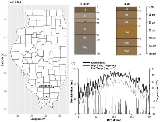 (a) Location of two growers’ fields, Marion and Springerton in southern Illinois, (b) schematic diagram of soil profile of two dominant soil series, ‘Bluford’ and ‘Rend’ found at Springerton and Marion and sites, respectively, and (c) daily high and low air temperatures (°C) and precipitation (cm) during 2022 growing season in Carbondale, Illinois.