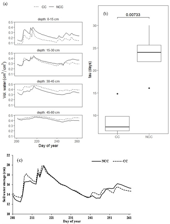 where SWC = the volumetric water content (m3 m−3), A = the initial soil water content m3 m−3, t = days since a rainfall event, τ = the constant that modulates the rate at which the soil dries, and θres = residual soil water content (m3 m−3). Soil water drydown events are identified in the soil water time series as periods in which the temporal change in soil water was negative for greater than or equal to five days [24]. For each drydown period, the equation was fitted to soil water using non-linear least square fitting. We compared the differences in the rate of drydown between CC and NCC.