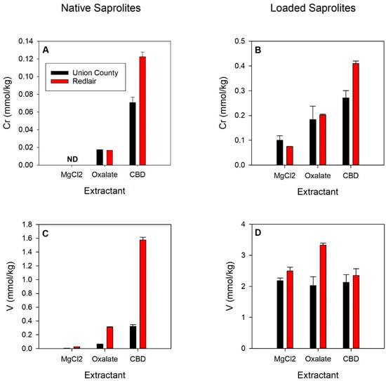 3.4. Chemical Extractions of Native and Cr- and V-Loaded Saprolites