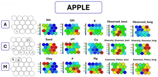 Observing the heatmaps for each experimental variable, showing the value distribution among the units in color-code (the right side of Figure 1), it is possible to observe the relationship between variables and groups. In particular, the group Atlantic (A) is characterized by higher values of Mg and K. The group Continental (C1) is characterized by high values of silt and low values of pH and clay. The group Continental (C2) is characterized by high values of sand, OM, P, Mg, Ca, Evenness_Pielou_fung, and all the variables related to bacteria; for the group C2, low values of silt and clay are shown. The group Continental (C3) is characterized by high values of sand, Obs_fung, and Diversity_Shannon_fung and low values of silt and clay. The group Mediterranean (M) is characterized by high values of clay and pH and low values of sand, OM, P, K, Mg, Obs_bact, Diversity_Shannon_bact, Obs_fung, and Diversity_Shannon_fung.