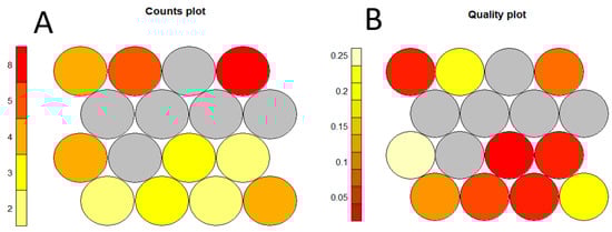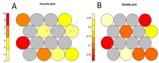 SOM analysis was performed to identify the key characteristics that make up the dominant patterns in the dataset (pattern extraction) and to discover which data items were similar to each other with respect to these characteristics (clustering). The characteristics of the predominant patterns are revealed by the high-dimensional vectors associated with each map node—the location of which is defined by the combination of dimension values that make up its vector. As data elements are mapped to their nearest map nodes after training, clusters of data elements with similar characteristics are formed. Coloring was used to indicate dimensional weights (values) at each node, with a separate component plane showing the values of each dimension of the SOM. The axes and grid nodes corresponded exactly to those of the SOM output map [28,29,30]. Count plots were obtained to show the number of objects mapped to the individual units. Empty units were depicted in gray. Quality plots were obtained to show the mean distance of objects mapped to a unit to the codebook vector of that unit. The smaller the distance, the better the objects were represented by the codebook vectors.